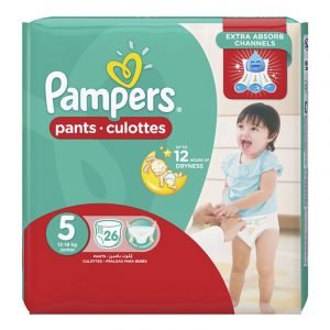 3 امتصاص إضافي يوزع البللسهل ومريح للتغيير12 ساعة من الجفاف مع حبيبات دقيقة ماصةأحزمة مطاطيةمن السهل سحب مثل السراويلحزام قابل للتنفس لراحة الطفلمقاس 5: جونيور (12-18 كجم)الكمية: 26..