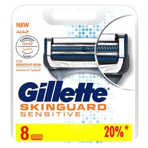 تقلل ماكينة الحلاقة SkinGuard من ملامسة الشفرة للبشرة الحساسة ، لذلك لن تقترب من الحلاقة كما تتوقع من ماكينات الحلاقة ذات 5 شفرات.تم تصميم ماكينة الحلاقة SkinGuard من Gillette لمنع التهيج وهي مثبتة إكلينيكيًا للبشرة الحساسةيتم وضع ميزة SkinGuard بين الشفر