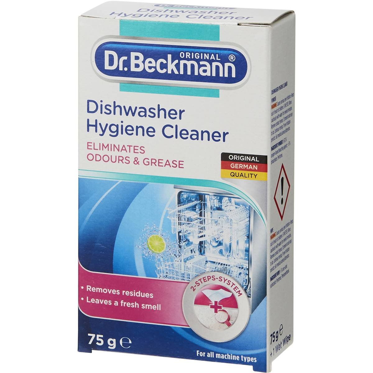 يمنع المنظف الصحي لغسالة الأطباق من دكتور بيكمان تراكم الأوساخ وبقايا المنظفات في الحشوات والمفاصل والأماكن المخفية. يتم تنظيف الأختام والحواف المطاطية وصيانتها بمنشفة خاصة. ينظف المسحوق بشكل صحي غسالة الأطباق وخاصة الأجزاء التي يصعب الوصول إليها مثل المن